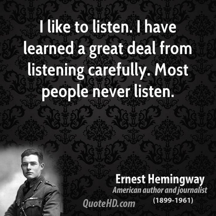 “I like to listen. I have learned a great deal from listening carefully. Most people never listen.” – relationship quotes by Ernest Hemingway