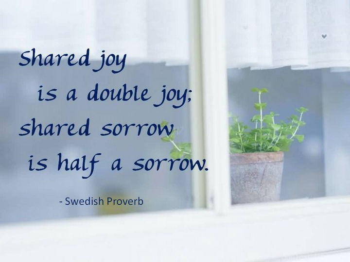 “Shared joy is a double joy; shared sorrow is half a sorrow.” – Swedish Proverb
