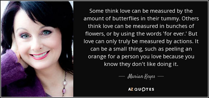 “Some think love can be measured by the amount of butterflies in their tummy. Others think love can be measured in bunches of flowers, or by using the words ‘for ever.’ But love can only truly be measured by actions. It can be a small thing, such as peeling an orange for a person you love because you know they don’t like doing it.” – Marian Keyes