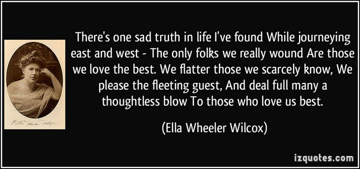 “There’s one sad truth in life I’ve found While journeying east and west – The only folks we really wound Are those we love the best. We flatter those we scarcely know, We please the fleeting guest, And deal full many a thoughtless blow To those who love us best.” – Ella Wheeler Wilcox