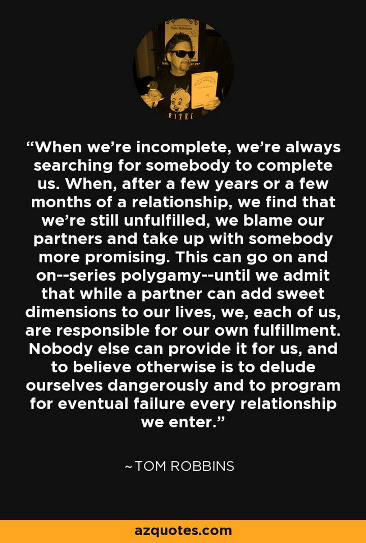 “When we’re incomplete, we’re always searching for somebody to complete us. When, after a few years or a few months of a relationship, we find that we’re still unfulfilled, we blame our partners and take up with somebody more promising. This can go on and on–series polygamy–until we admit that while a partner can add sweet dimensions to our lives, we, each of us, are responsible for our own fulfillment. Nobody else can provide it for us, and to believe otherwise is to delude ourselves dangerously and to program for eventual failure every relationship we enter.” – Tom Robbins