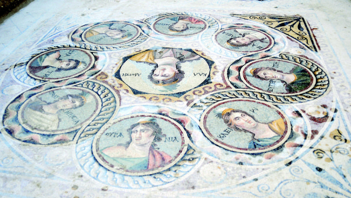 Archaeologists made an amazing discovery in the city of Zeugma, Turkey. They unearthed ancient Greek mosaics showing the nine Muses: Calliope, Clio, Erato, Euterpe, Melpomene, Ourania, Polymnia, Terpsichore, and Thalia.