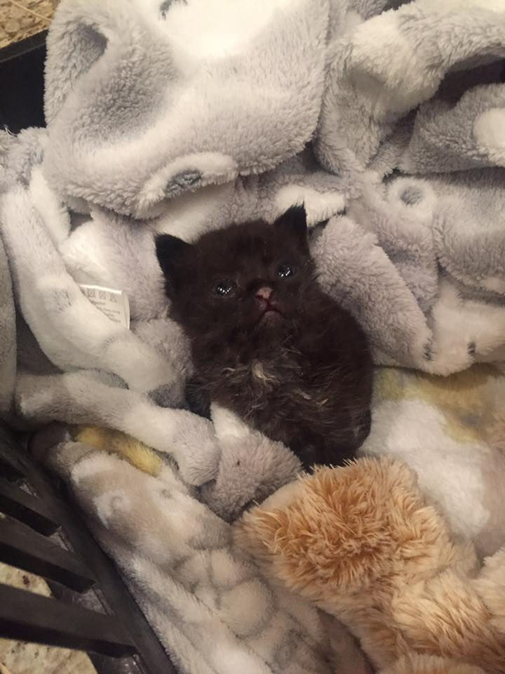 This tiny kitten was rescued after surviving 3 days without food or water.