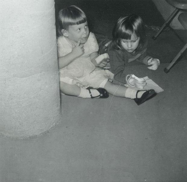 Danielle Delph, an Art Director, photoshops herself into mom’s pictures. Here is Danielle drawing with her mother on the left.