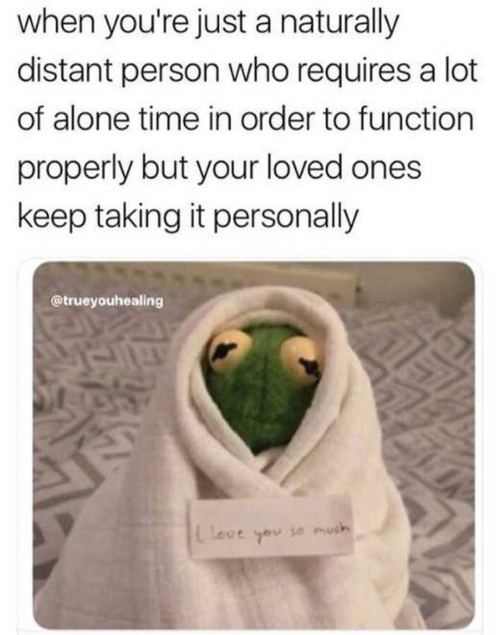 “When you’re just a naturally distant person who requires a lot of alone time to function properly but your loved ones keep taking it personally.”