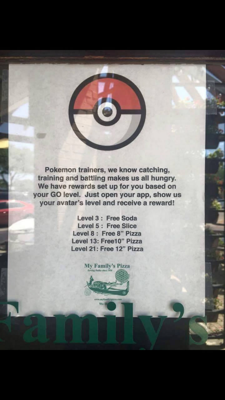 “Pokémon trainers, we know catching, training, and battling makes us all hungry. We have rewards set up for you based on your GO level. Just open your app, show us your avatar’s level, and receive a reward! Level 3: Free Soda. Level 5: Free Slice. Level 8: Free 8″ Pizza, Level 13: Free 10″ Pizza. Level 21: Free 12″ Pizza.”