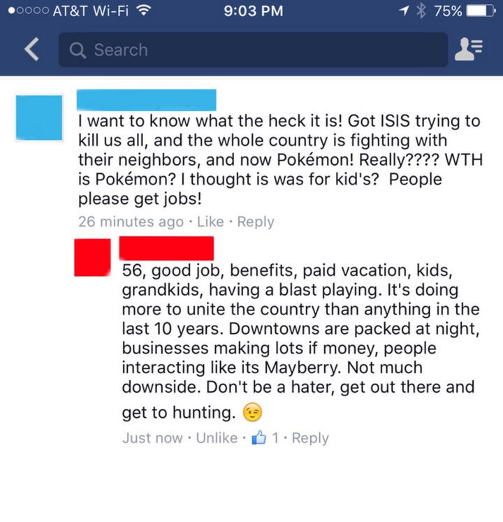 “I want to know what the heck it is! Got ISIS trying to kill us all, and the whole country is fighting with their neighbors, and now Pokémon! Really???? WTH is Pokémon? I thought it was for kids. People, please get jobs! 56, good job, benefits, paid vacation, kids, grandkids, having a blast playing. It’s doing more to unite the country than anything in the last 10 years. Downtowns are packed at night, businesses making lots of money, and people interact like it’s Mayberry. Not much downside. Don’t be a hater, get out there and get to hunting.”