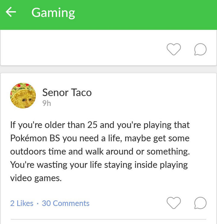 “If you’re older than 25 and you’re playing that Pokémon BS you need a life, maybe get some outdoor time and walk around or something. You’re wasting your life staying inside playing video games.”