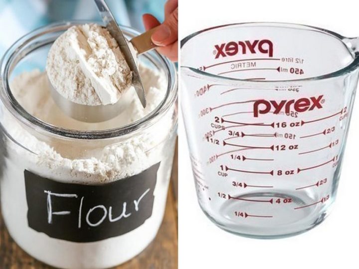 When it comes to measuring liquids, only liquid measuring cups like the Pyrex liquid measuring cup pictured above. Likewise, dry ingredients should only be measured with standard measure cups so that you can easily scrape off any excess and get a precise measurement.