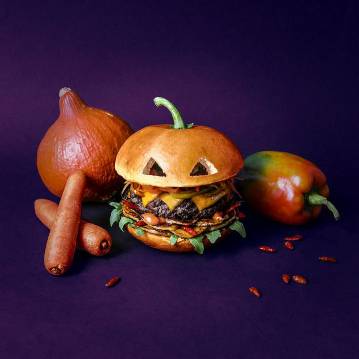 With shredded carrots and grilled peppers and cheese, the Pumpkin Brrrrrger is a Halloween delight!