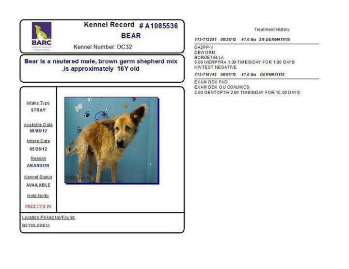 His kennel card listed that he was abandoned but no one wanted to adopt 16-year-old “Bear” that needed a family.