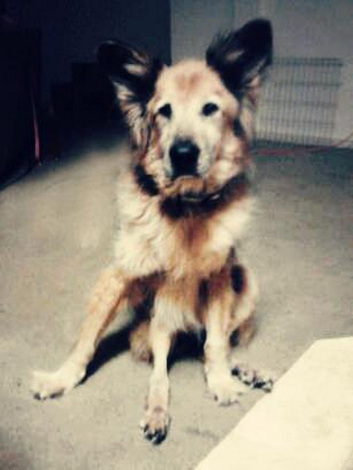 Weeks later, he looks like a new dog! His coat is thick and shiny, he gained back some of his weight, and he looks happy in his new home.