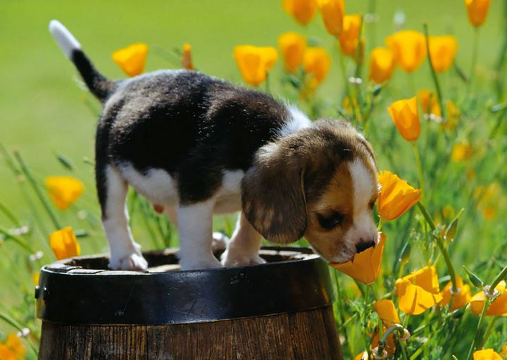 7) Adorable puppy playing in a fragrant field of flowers.