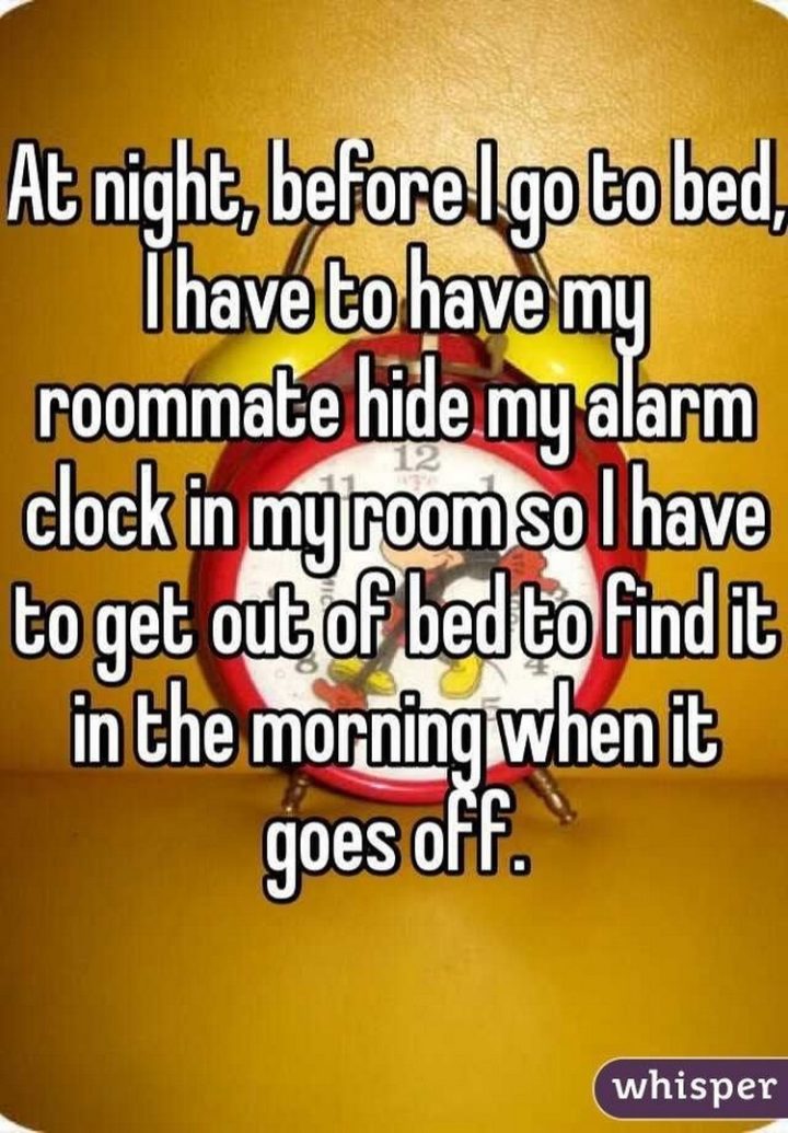 “At night, before I go to bed, I have to have my roommate hide my alarm clock in my room so I have to get out of bed to find it in the morning when it goes off.”