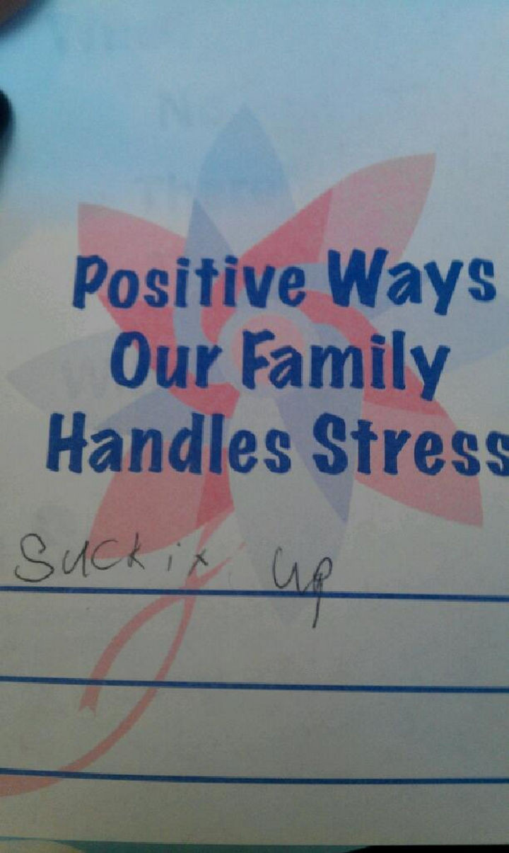 It reads, “Positive ways our family handles stress: Suck it up.”