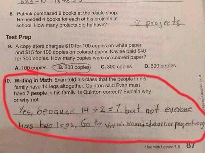 It reads, “Evan told his class that the people in his family have 14 legs altogether. Quinton said Evan must have 7 people in his family. Is Quinton correct? Explain why or why not. Yes, because 14 divided by 2 equals 7 but not everyone has two legs. Go to www.woundedwarriorproject.org”