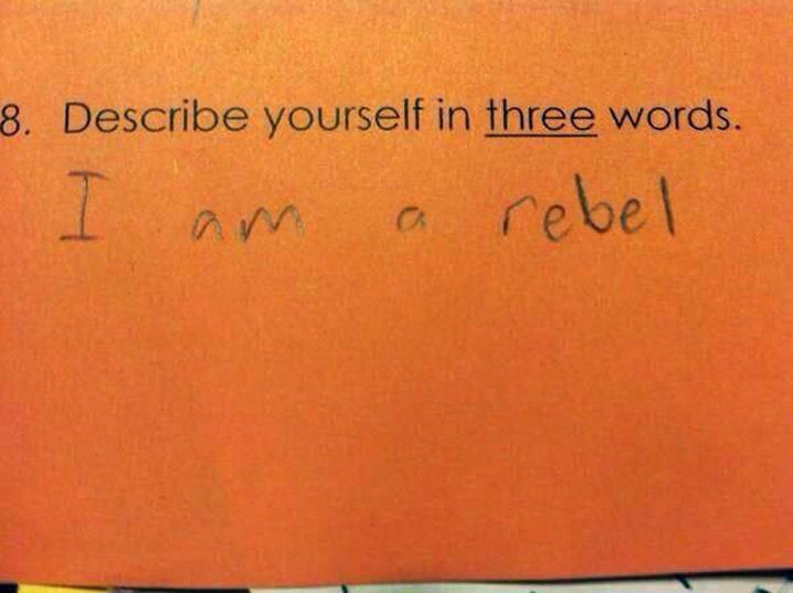 It reads, “Describe yourself in THREE words. I am a rebel.”