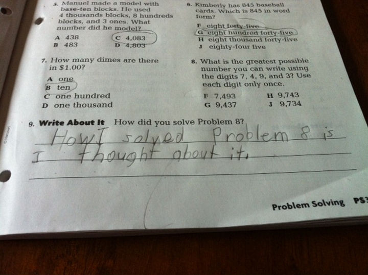 It reads, “How did you solve Problem 8? How I solved Problem 8 is I thought about it.”