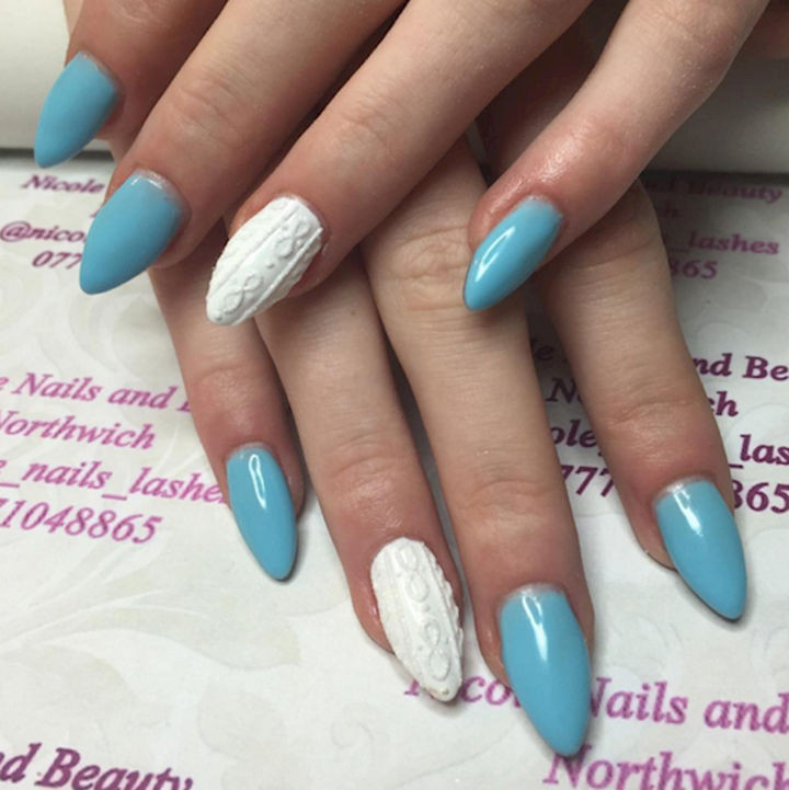 5) Knitted sweater accent nails complement icy blue lacquered nails.
