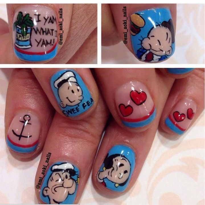 13) Look as cute as Swee’Pea with this Popeye cartoon nail art design.
