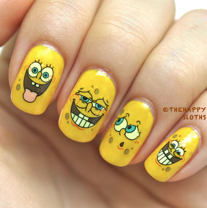 17) SpongeBob SquarePants has tons of facial expressions and this cartoon nail art features just some of the many faces of SpongeBob.