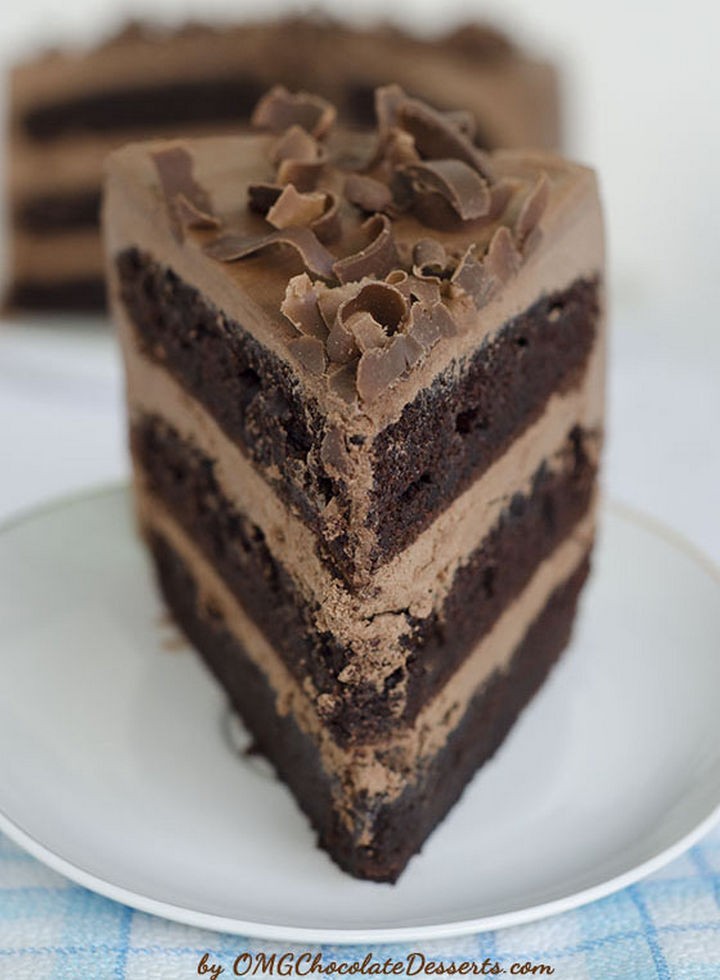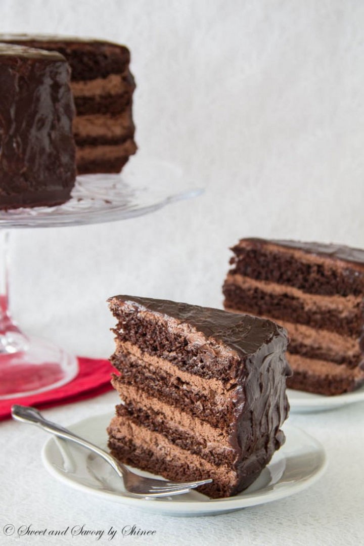 In this sinful chocolate cake, there are 4 layers of chocolate cake goodness surrounded by thick velvety chocolate mousse. Try this recipe for Supreme Chocolate Cake with Chocolate Mousse Filling.
