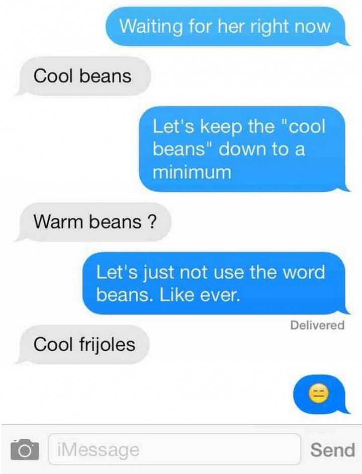 “Waiting for her right now. Cool beans. Let’s keep the ‘cool beans’ down to a minimum. Warm beans? Let’s just not use the word beans. Like ever. Cool frijoles.”
