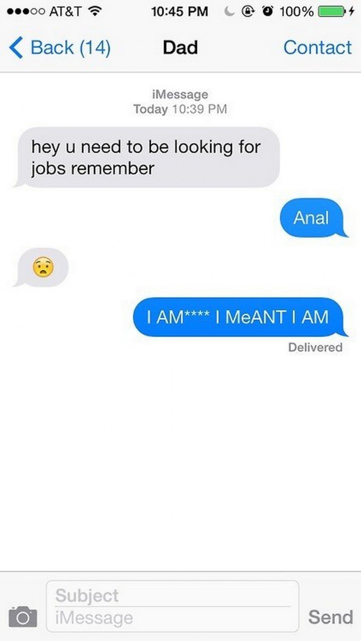 “Hey u need to be looking for jobs remember. Anal. I am. I meant I am.”