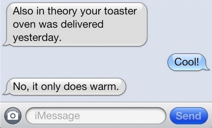 “Also in theory your toaster oven was delivered yesterday. Cool! No, it only does warm.”