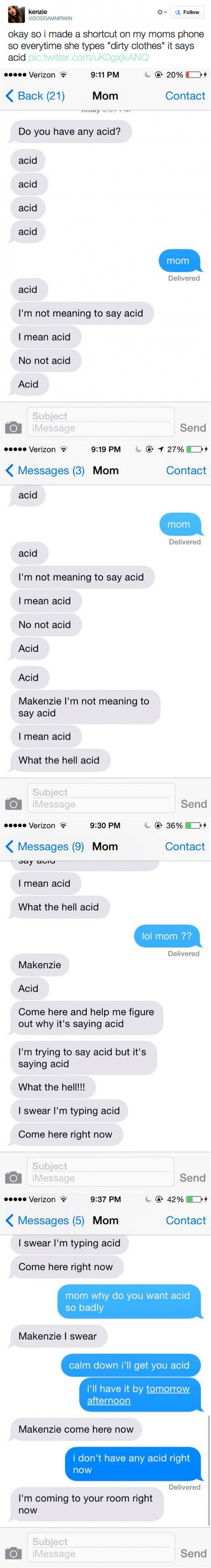 “Okay, so I made a shortcut on my mom’s phone so every time she types ‘dirty clothes’ it says acid.”