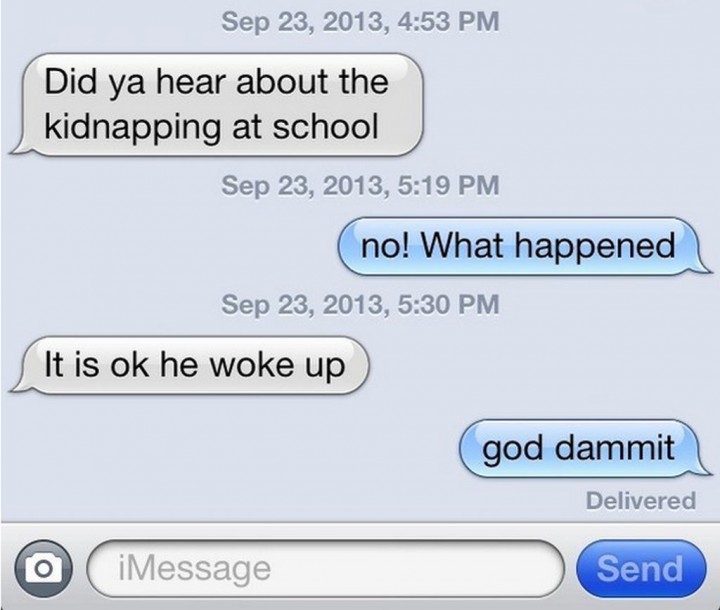 “Did ya hear about the kidnapping at school? No! What happened. It is ok, he woke up. Goddammit.”