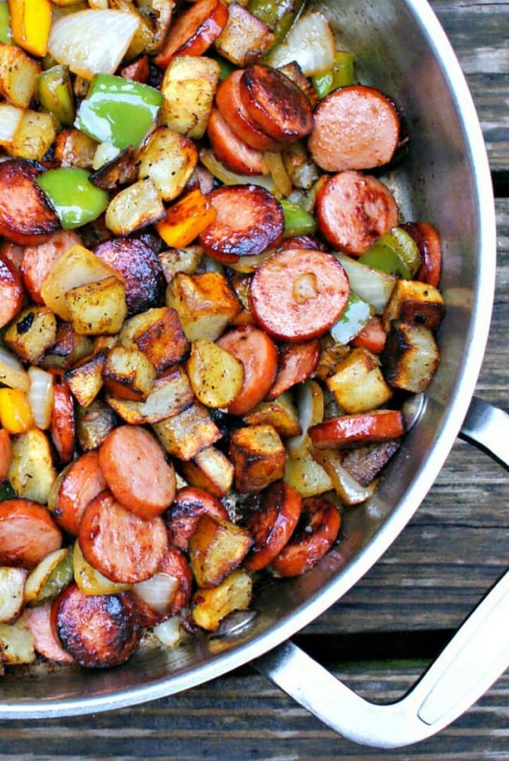 15) Camping Meals – Kielbasa, Pepper, Onion and Potato Hash