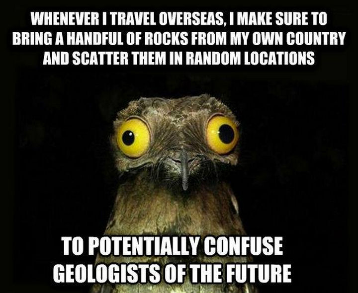 “Whenever I travel overseas, I make sure to bring a handful of rocks from my own country and scatter them in random locations to potentially confuse geologists of the future.”