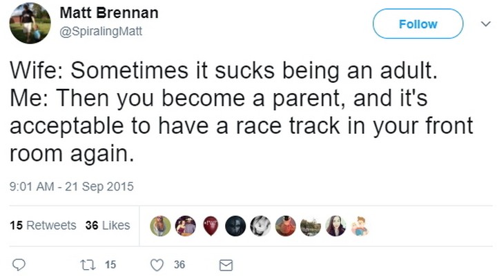 “Wife: Sometimes it sucks being an adult. Me: Then you become a parent, and it’s acceptable to have a race track in your front room again.”