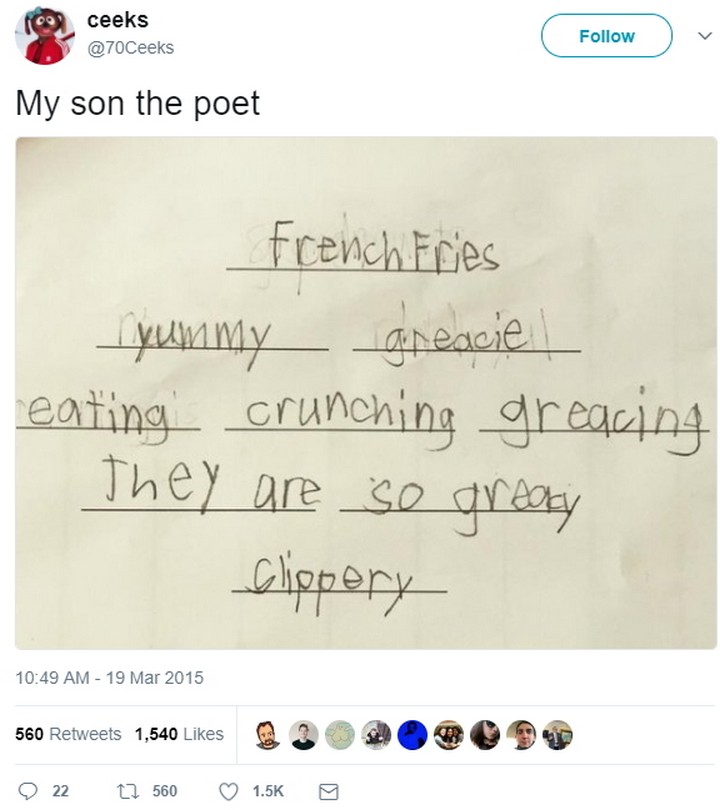 “My son the poet: French fries yummy greasy eating crunching greasing they are so greasy slippery.”