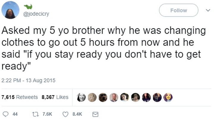 “Asked my 5-year-old brother why he was changing clothes to go out 5 hours from now, and he said ‘if you stay ready, you don’t have to get ready.'”