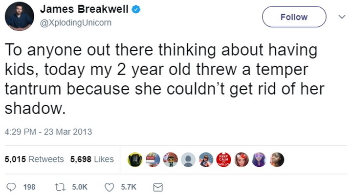 “To anyone out there thinking about having kids, today my 2-year-old threw a temper tantrum because she couldn’t get rid of her shadow.”