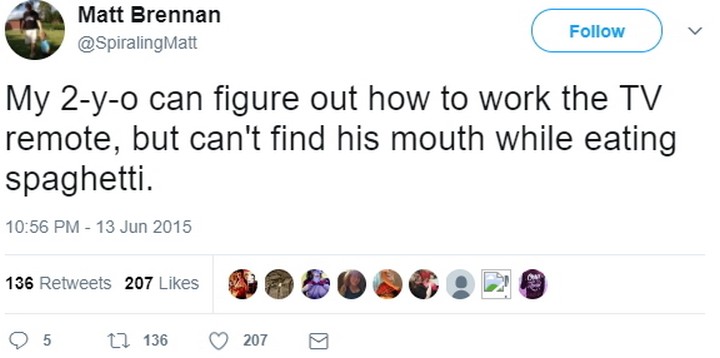 “My 2-year-old can figure out how to work the TV remote, but can’t find his mouth while eating spaghetti.”