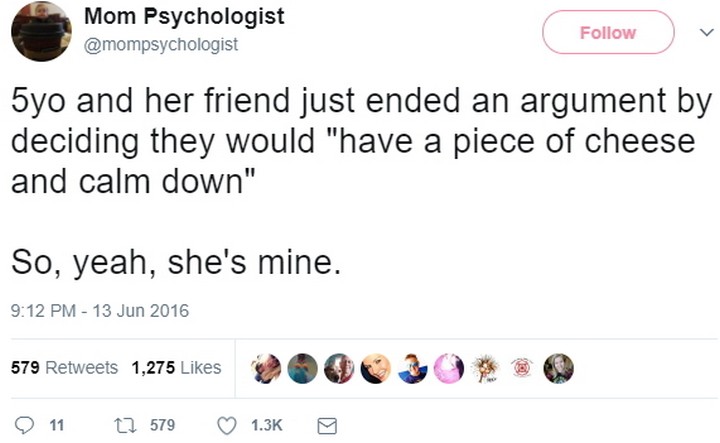 “A 5-year-old and her friend just ended an argument by deciding they would ‘have a piece of cheese and calm down.’ So, yeah, she’s mine.”