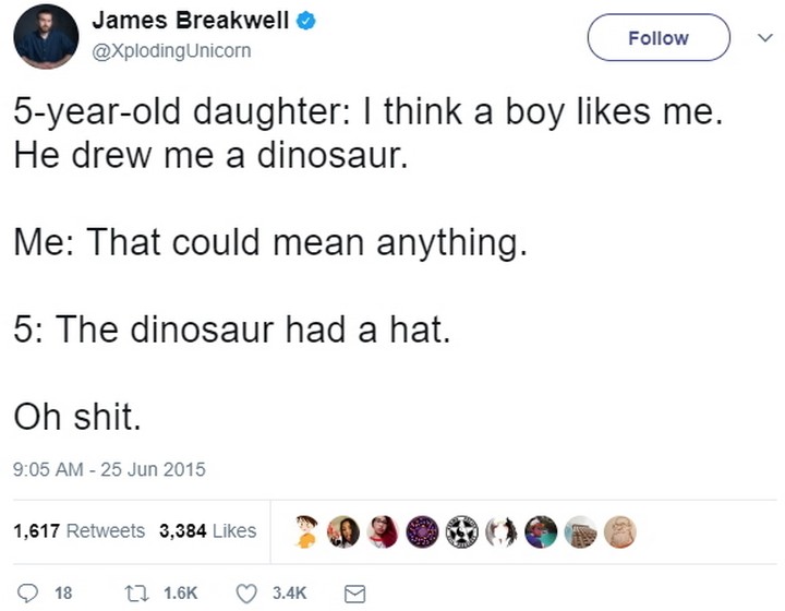 “5-year-old daughter: I think a boy likes me. He drew me a dinosaur. Me: That could mean anything. 5: The dinosaur had a hat. Oh shit.”