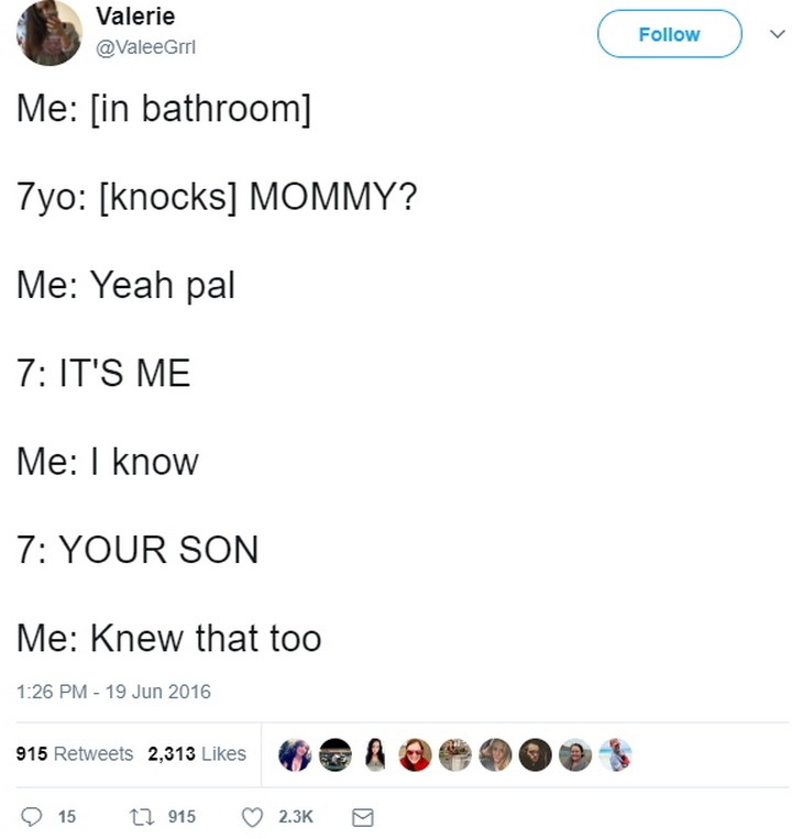 “Me: [In bathroom]. 7-year-old: [knocks] MOMMY? Me: Yeah, pal. 7: IT’S ME. Me: I know. 7: YOUR SON. Me: Knew that too.”