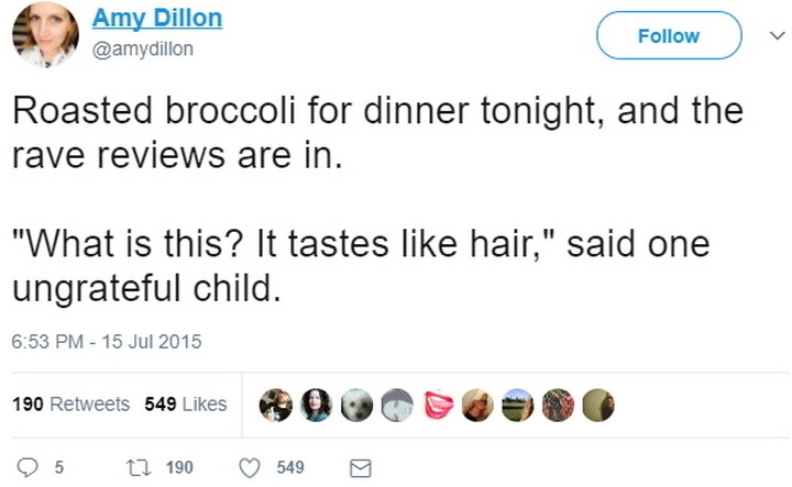“Roasted broccoli for dinner tonight, and the rave reviews are in. ‘What is this? It tastes like hair,’ said one ungrateful child.”