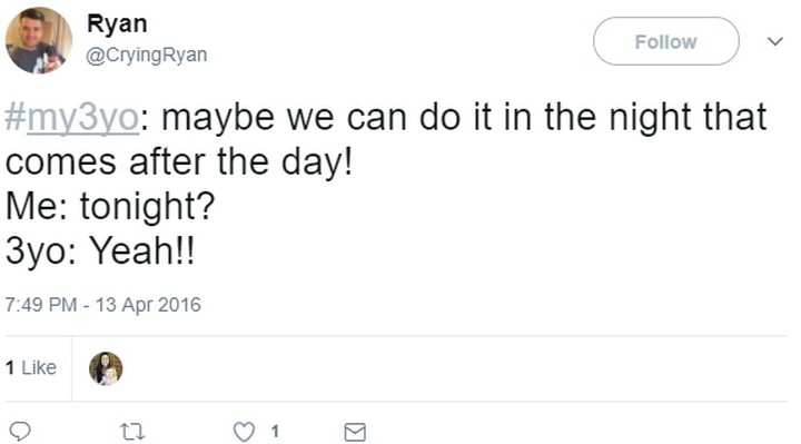 “My 3-year-old: Maybe we can do it in the night that comes after the day! Me: Tonight? 3-year-old: Yeah!!”