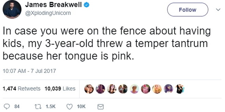 “In case you were on the fence about having kids, my 3-year-old threw a temper tantrum because her tongue is pink.”
