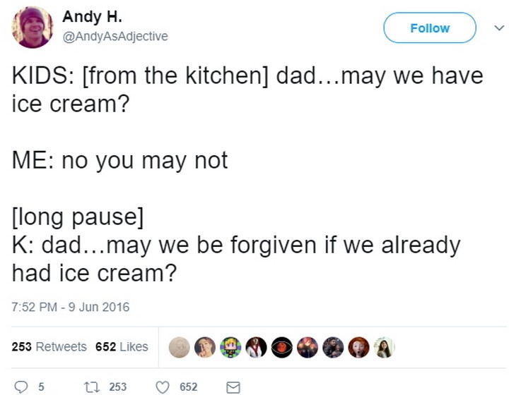 “KIDS: [from the kitchen] Dad…may we have ice cream? ME: No, you may not. [long pause] K: Dad…may we be forgiven if we already had ice cream?”