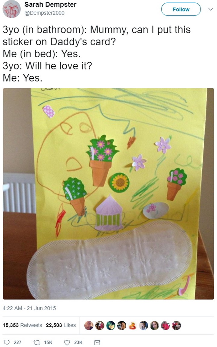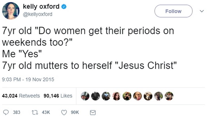 “7-year-old: Do women get their periods on weekends too? Me: Yes. 7-year-old mutters to herself ‘Jesus Christ.”