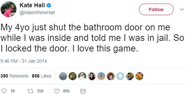 “My 4-year-old just shut the bathroom door on me while I was inside and told me I was in jail. So I locked the door. I love this game.”
