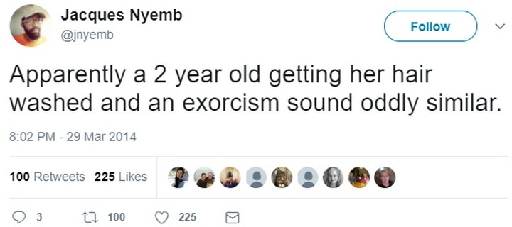 “Apparently, a 2-year-old getting her hair washed and an exorcism sound oddly similar.”