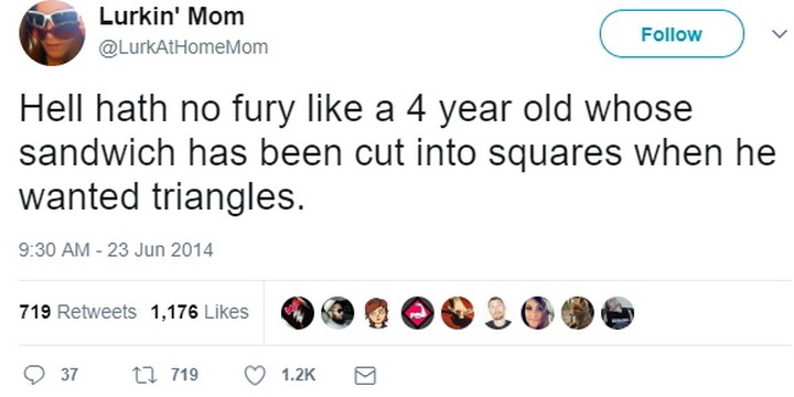 “Hell hath no fury like a 4-year-old whose sandwich has been cut into squares when he wanted triangles.”