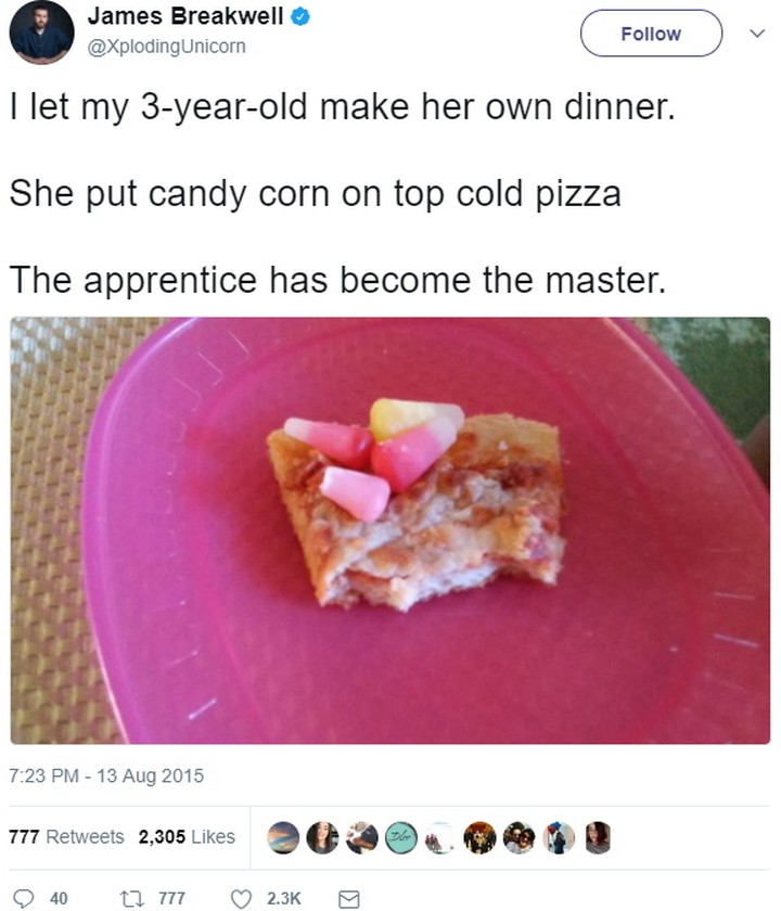 “I let my 3-year-old make her own dinner. She put candy corn on top of cold pizza. The apprentice has become the master.”